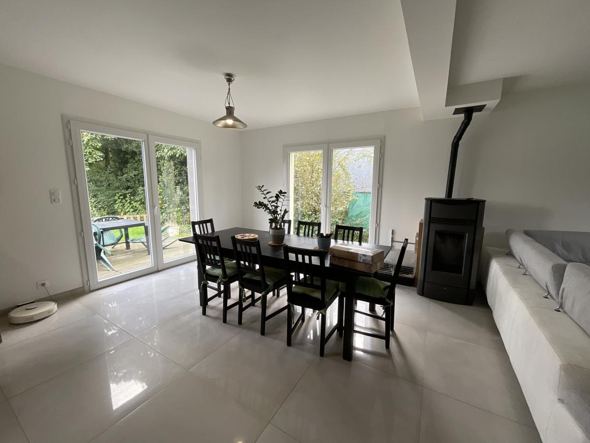 Pièce de vie ouverte sur la cuisine avec poêle à granules.