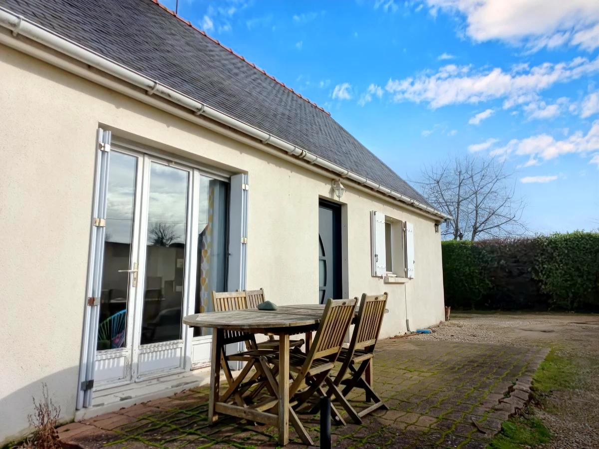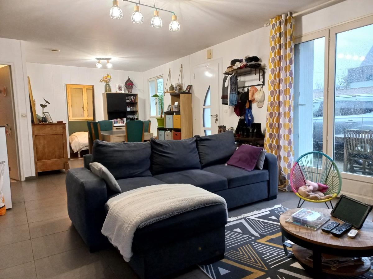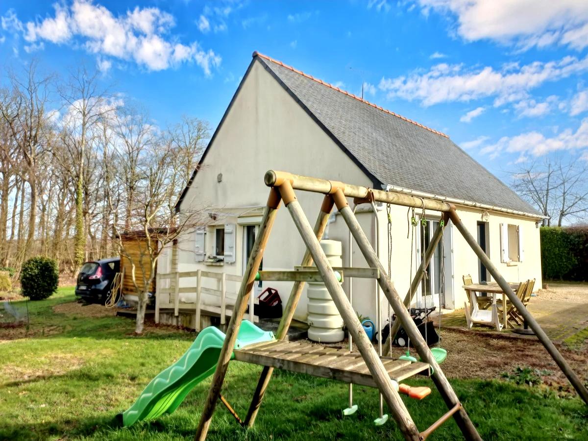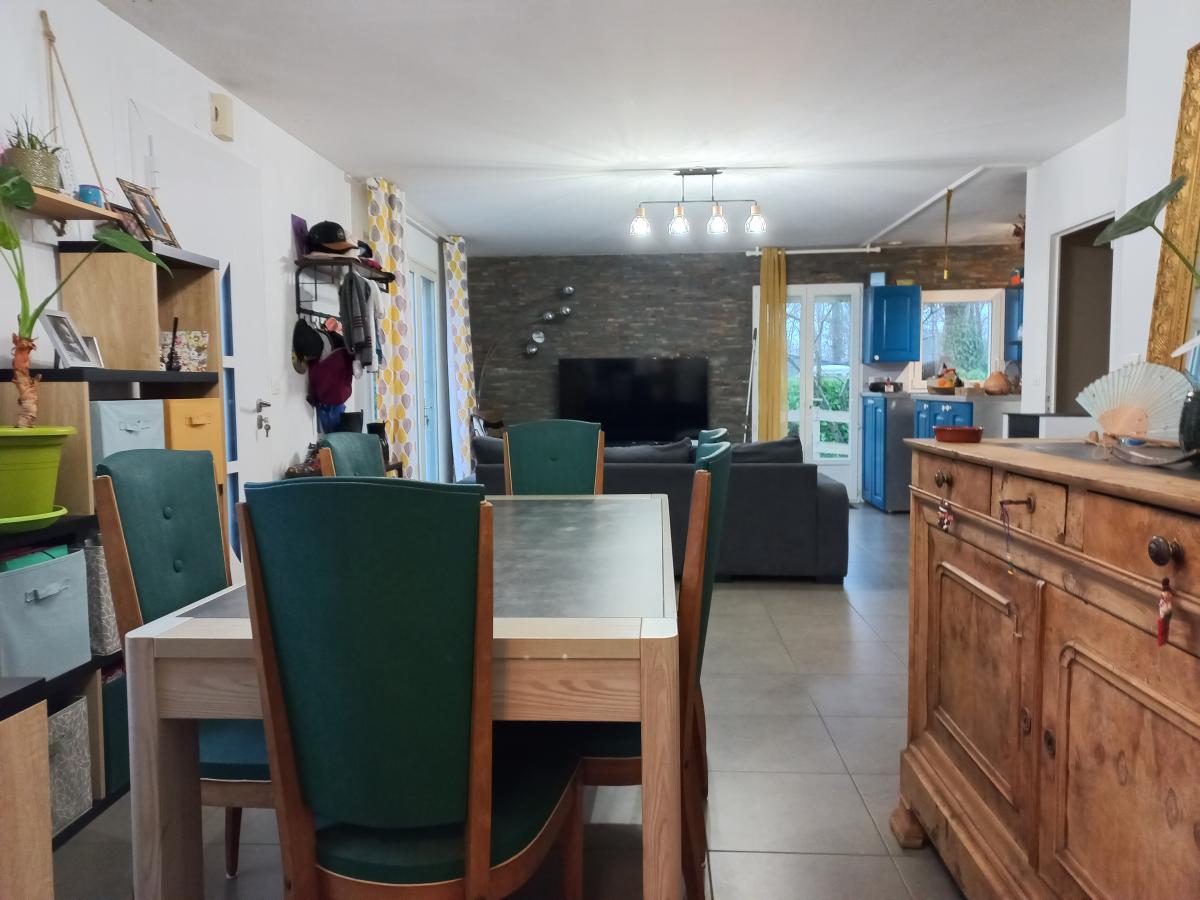 Maison de plain pied, comprenant : une pièce de vie avec cuisine aménagée et équipée et poêle à granulés, deux chambres, un bureau, une salle d'eau, un wc.