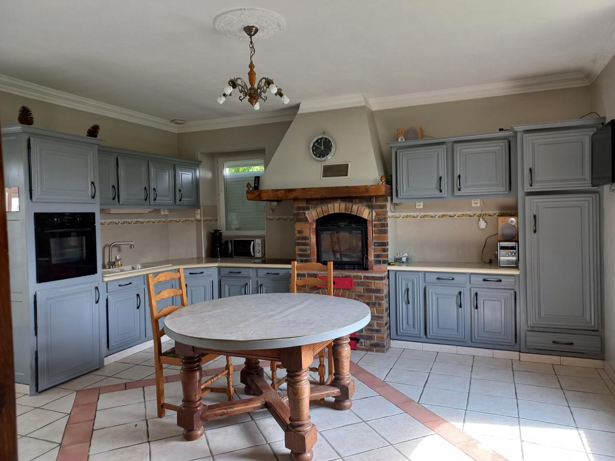 - au rez-de-chaussée : salle à manger, salon avec cheminée et mezzanine, cuisine aménagée et équipée avec accès véranda, placard, WC avec lave main, cellier, chaufferie.