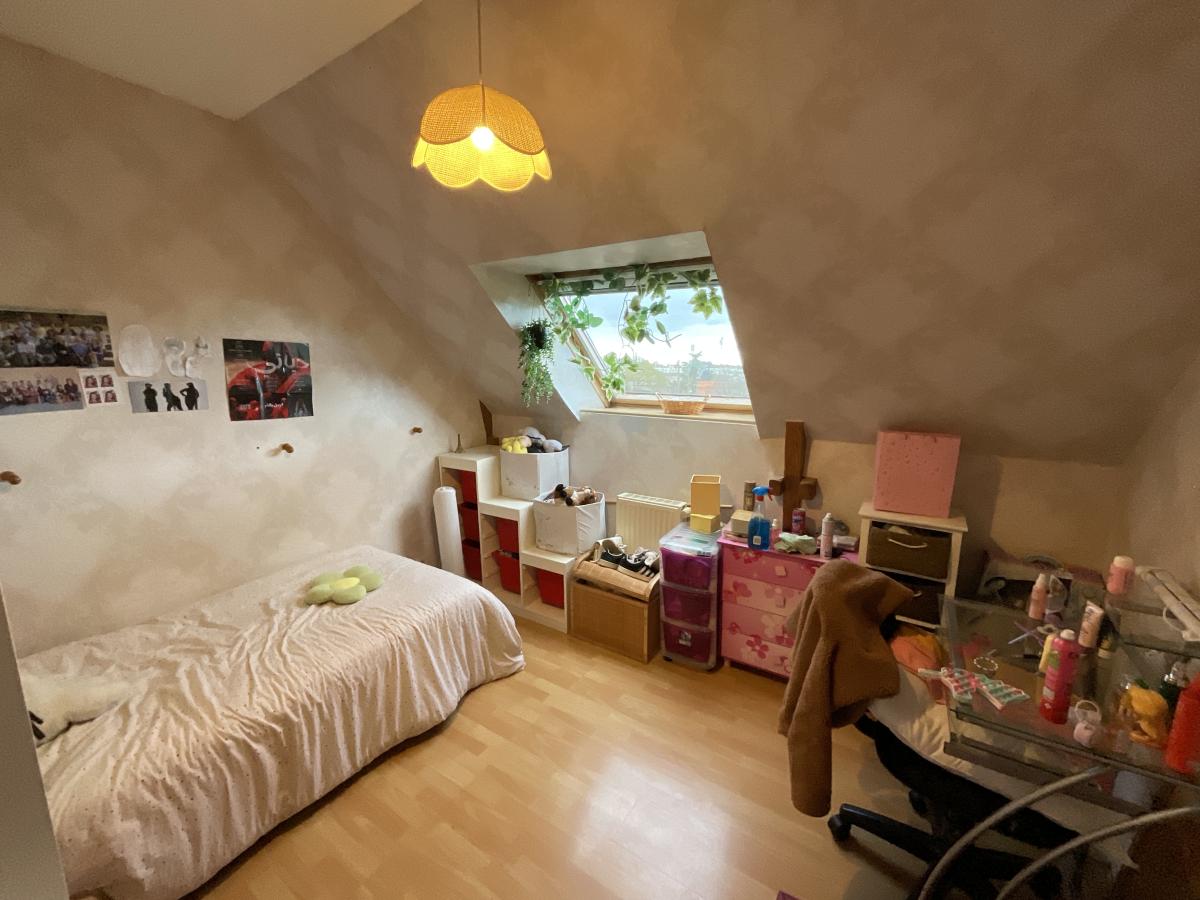 En duplex : palier, bureau, chambre, salle de bains, wc.